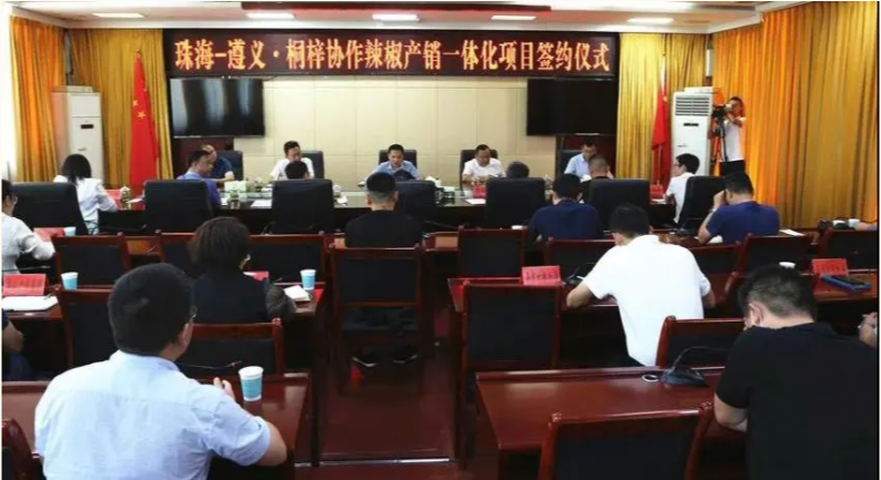 近日,“珠海-遵义· 桐梓协作辣椒产销一体化项目”签约仪式在桐梓县政府举行。桐梓县人民政府、珠海市菜篮子投资有限公司、辣妹子食品股份有限公司、遵义辣椒产业集团有限公司签订了四方合作协议,共同打造辣椒产销一体化产业。星空app官方站官网集团党委副书记刘国涛同志出席签约仪式。